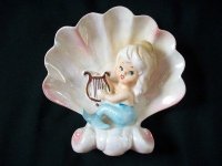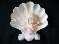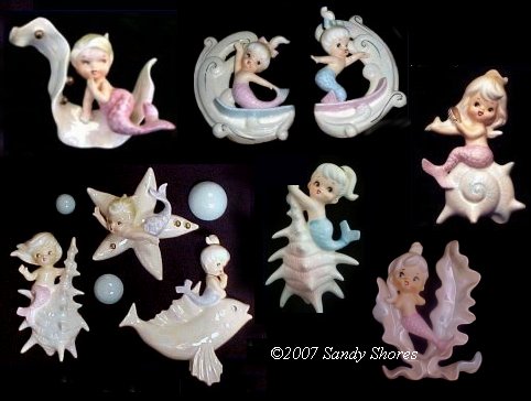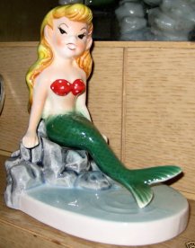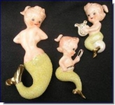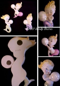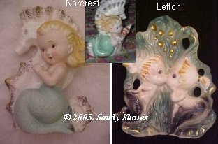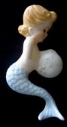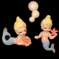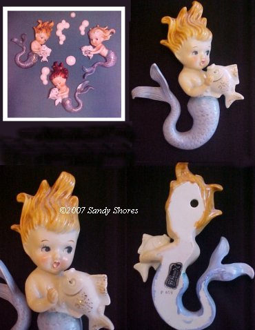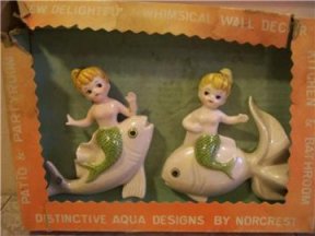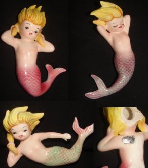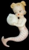 Norcrest made a number of blue and pink tailed mermaids and merboys that were attached to some sort of nautical piece... a shell, starfish, seaweed, riding a fish, etc. These are all