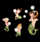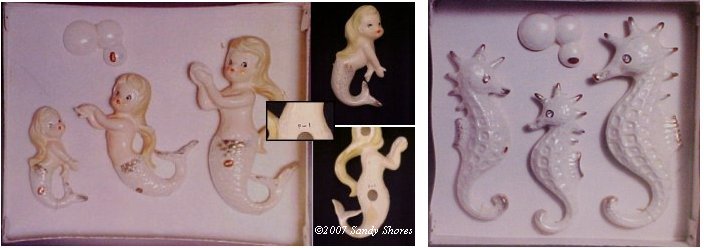back. There was one manufacturer (unknown but probably Japan) that made this set in chalkware - they were sold in a set with with the mom mermaid with a long ponytail - the paint was sprayed on, and their tailfins