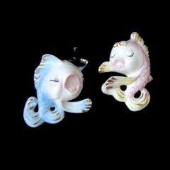 This is a gorgeous mermaid sister set by Norcrest. Each have a different color hair and they are holding white fish. The fish have gold highlighting and I have seen the tailfins with no gold glitter, a